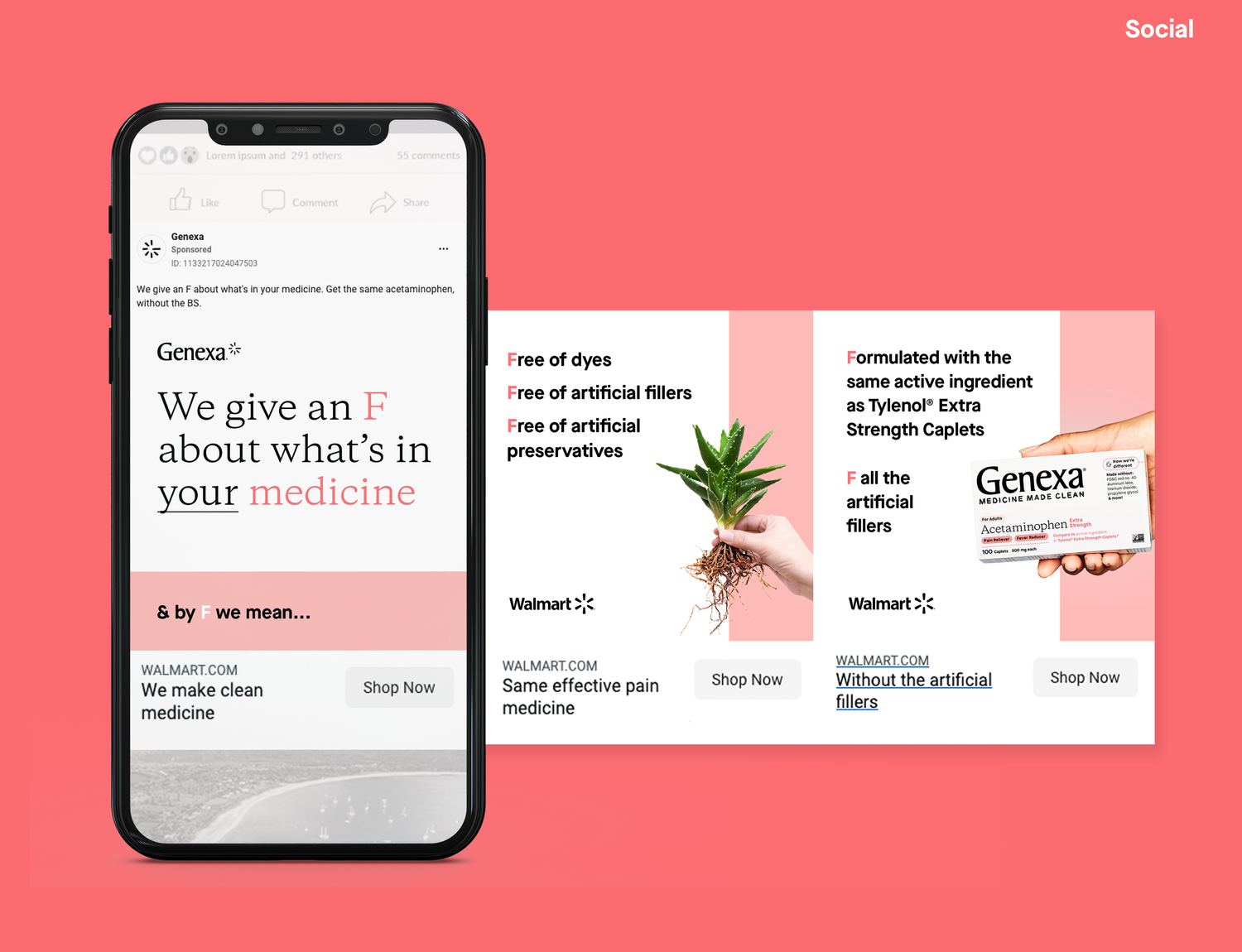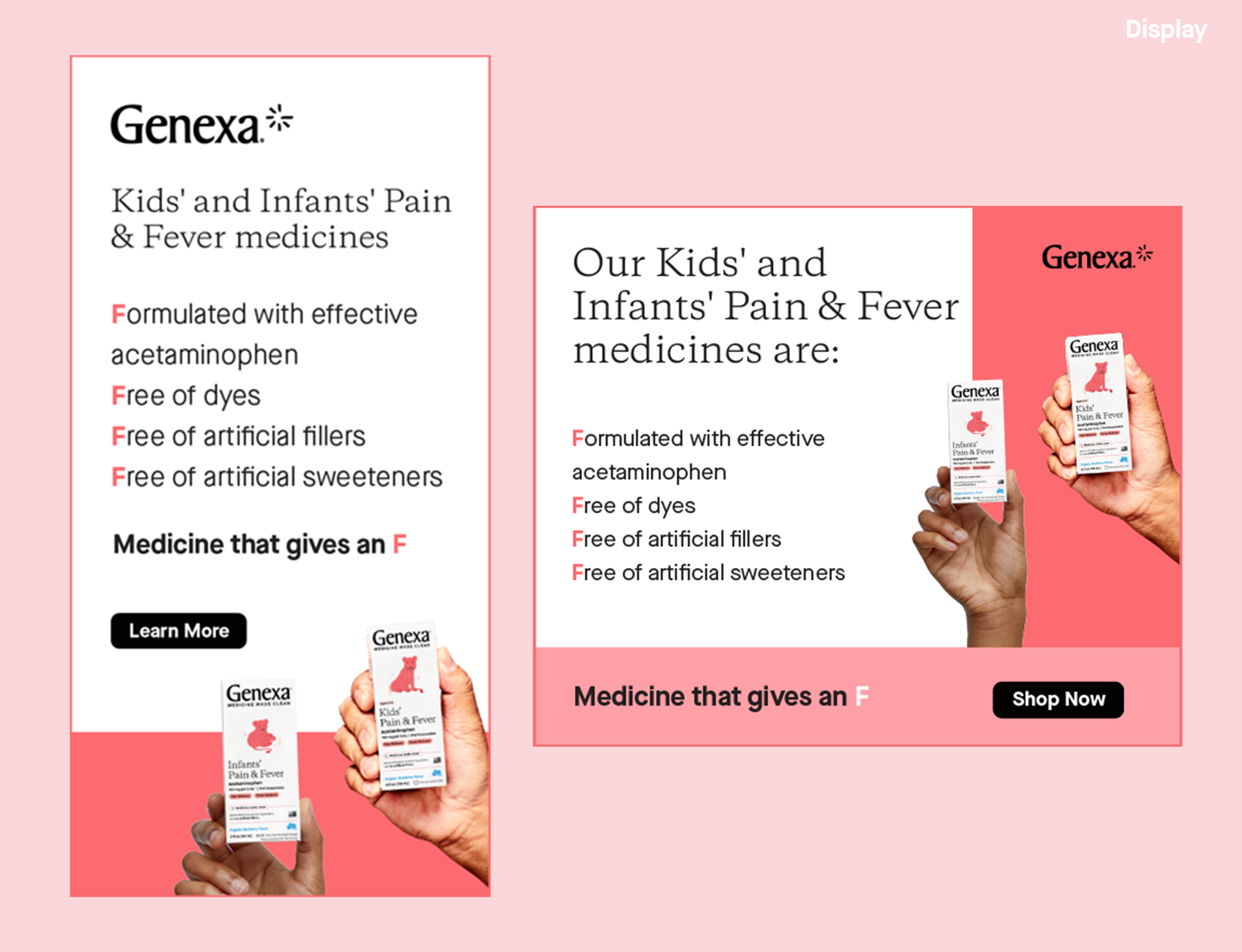 Enter Genexa, a cleaner alternative. Our goal was to amplify this little-known medicine brand’s key message: you should give an F about what goes into your kid’s medicine.